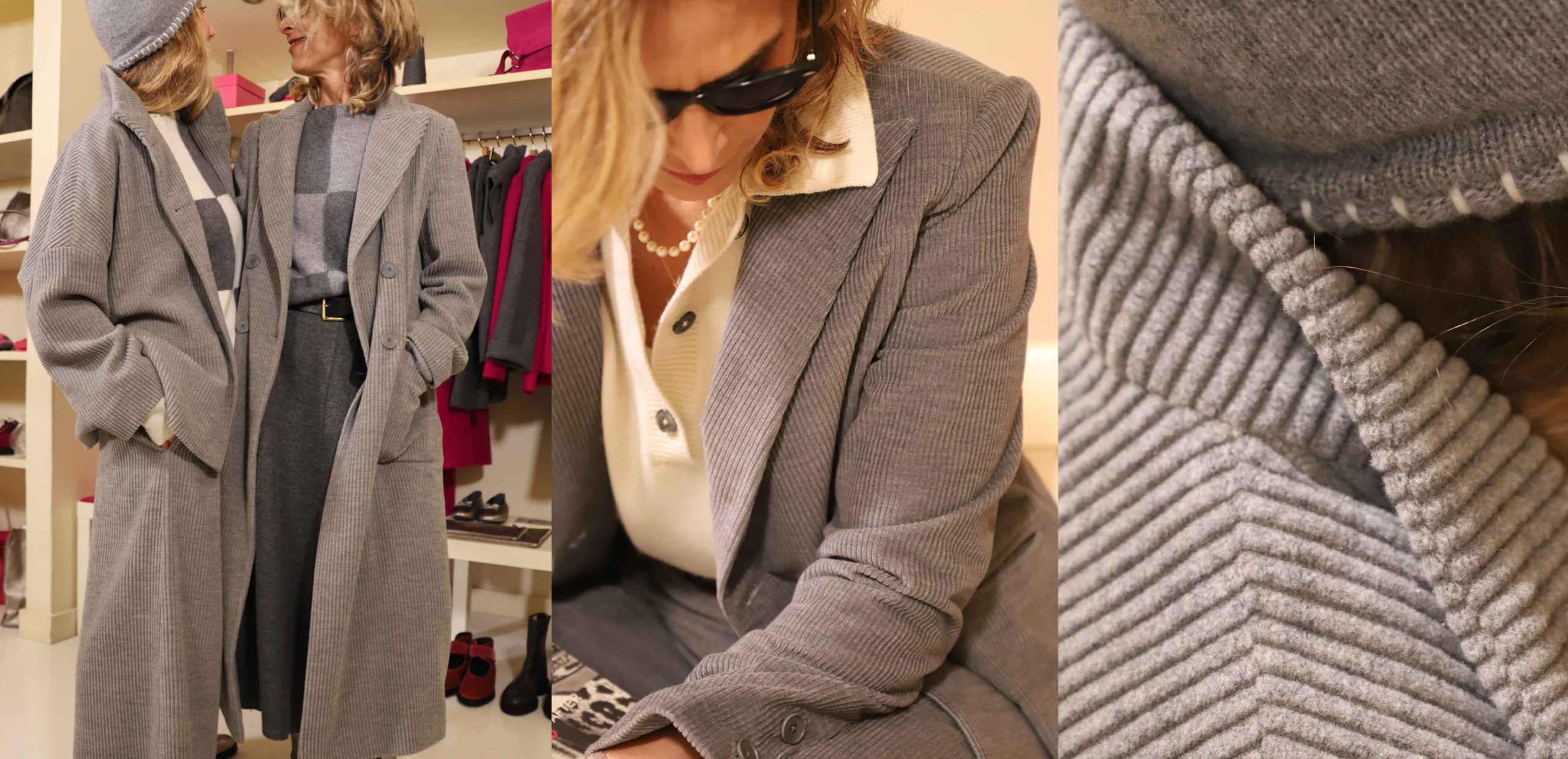 cappotto baby alpaca, blusa lana cotta e gonna velluto 1000 righe